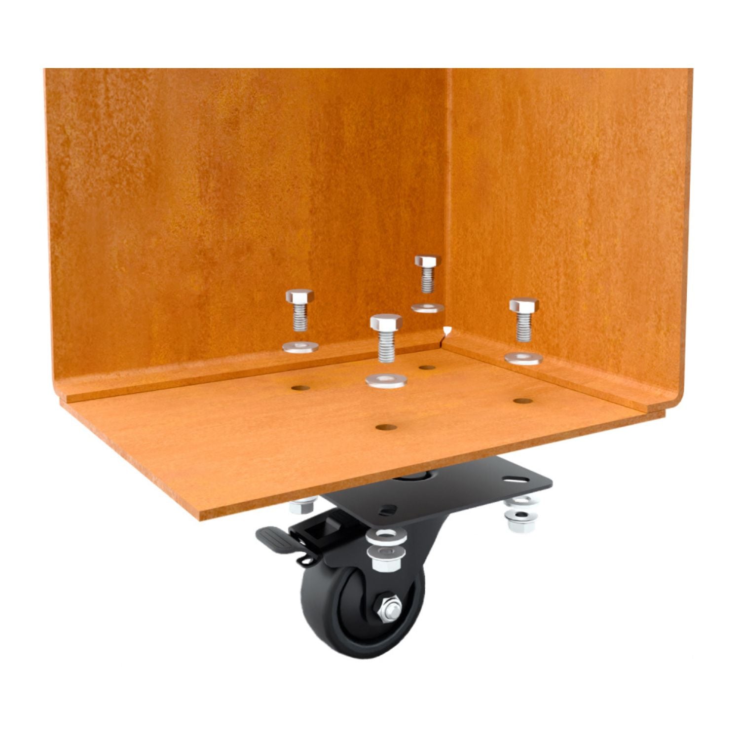 Vierkante cortenstalen plantenbak met wielen 40x40x100 cm
