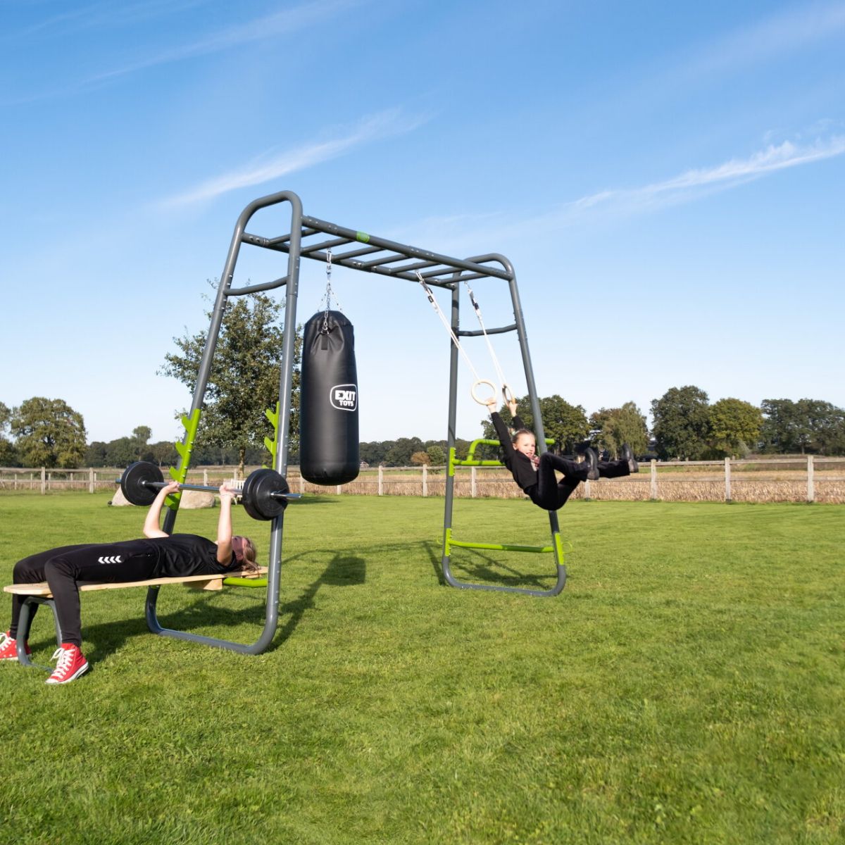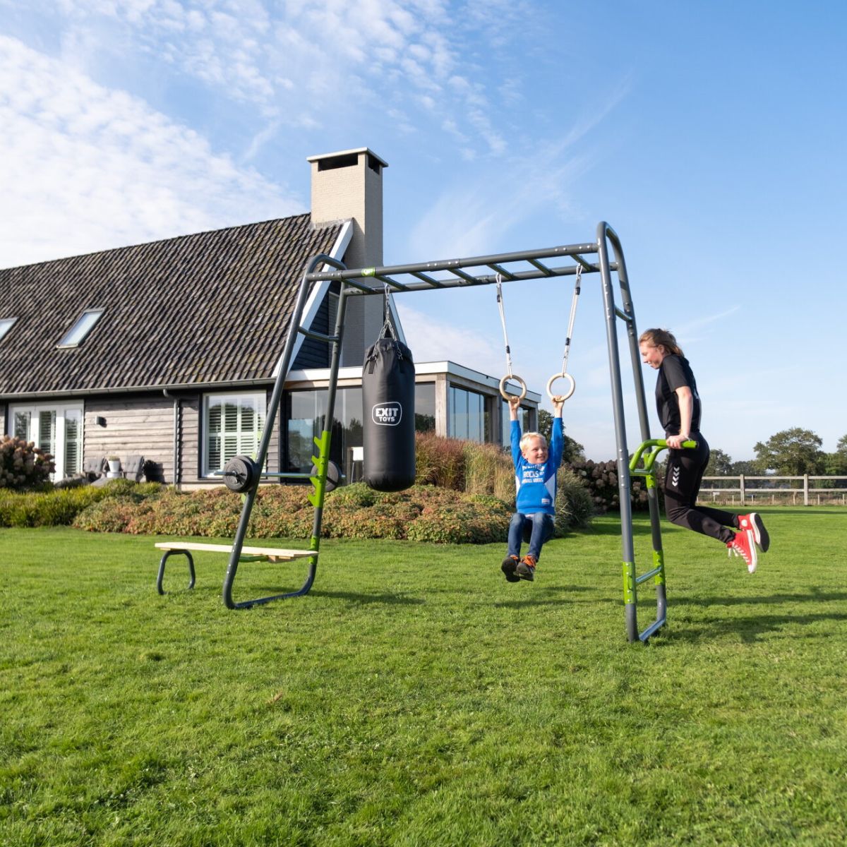 Do you want to transform your garden into a personal training area for yourself and your sporty teenagers? The EXIT GetSet monkey bar MB230 is a multifunctional outdoor fitness rack of over four metres long, specially designed for active 14-year-olds and adults. Thanks to the complete set of seven high-quality accessories – including a fitness bench, punching bag and barbell supports – this device offers a complete full-body workout in the fresh air. Train whenever you want, without compromise.