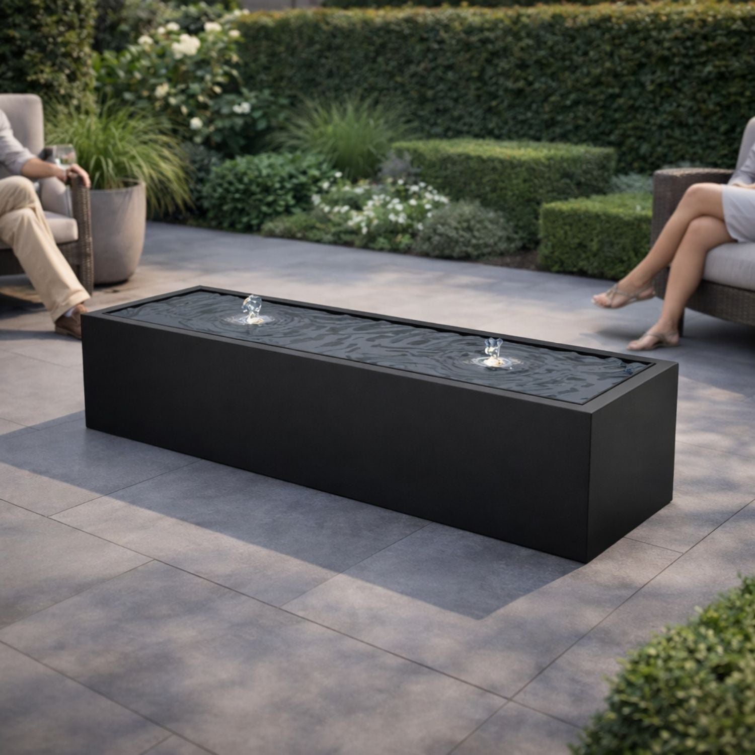 Our water tables are a unique decoration for gardens. The sleek, angular shapes add extra atmosphere and dynamics to any outdoor space. The Geroba Taula aluminum water table rectangular 200x60x40cm 39kg fits perfectly among the greenery and thanks to the standard pump and fountains with LED lighting, you can also optimally enjoy the soothing effect of running water in the dark.