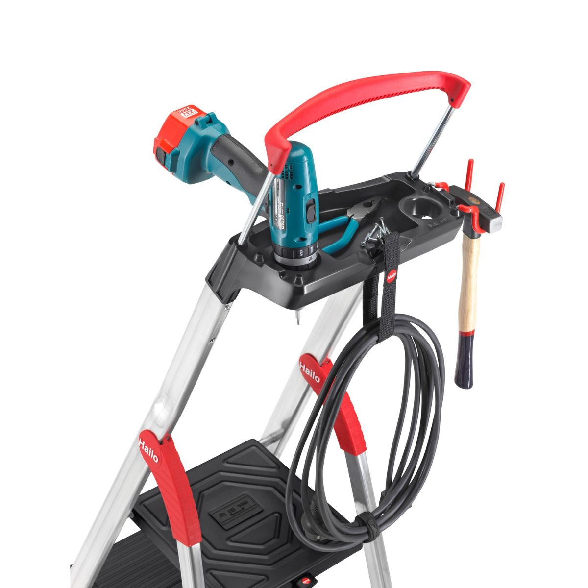 Die HAILO L100 TopLine Trittleiter vereint maximale Sicherheit mit Vielseitigkeit und Bedienkomfort. Die Aluminium-Sicherheits-Stehleiter ist sowohl für den privaten als auch den professionellen Einsatz konzipiert und mit cleveren Funktionen ausgestattet, die Ihre Arbeit sicherer und effizienter machen. Dank der extratiefen XXL-Stufen (130 mm), einer Multifunktionsablage und einem ausziehbaren Sicherheitsbügel arbeiten Sie stets stabil und haben alles in Reichweite. Die stabile Plattform mit Feststellmechanismus und Anti-Rutsch-Riffelung sorgt für einen sicheren Stand.