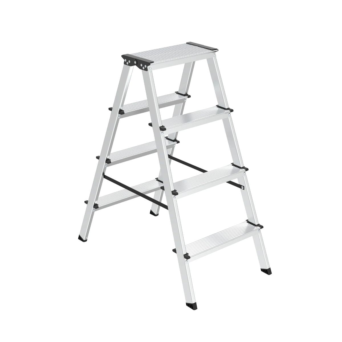Mit vier Stufen auf jeder Seite stehen Sie immer sicher und stabil. Die maximale Tragkraft der Stehleiter beträgt 150 kg und ist somit für alle Arten von Aufgaben zuverlässig.