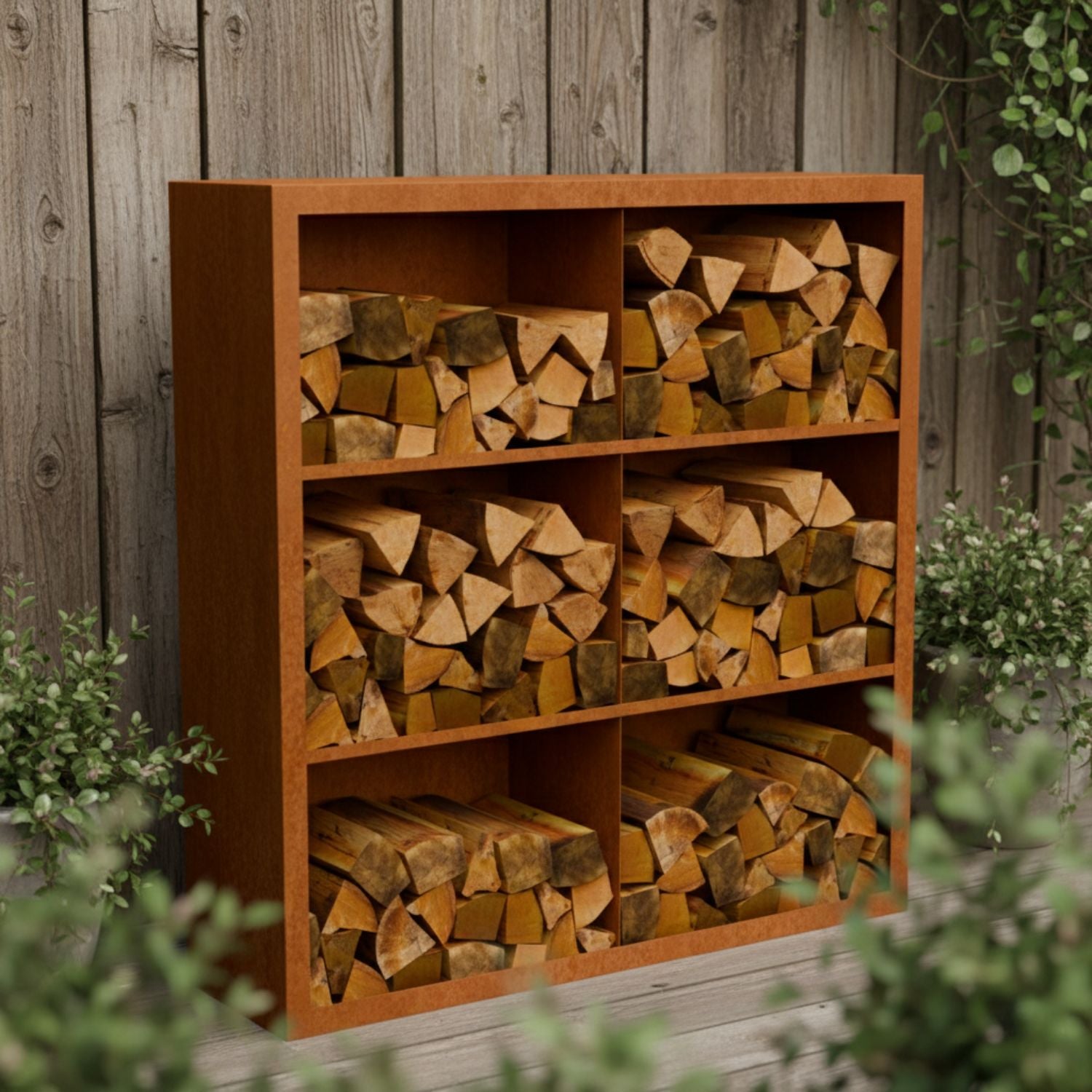 Cortenstalen houtopslag met 6 Vakken met achterwand 150x38,5x150 cm
