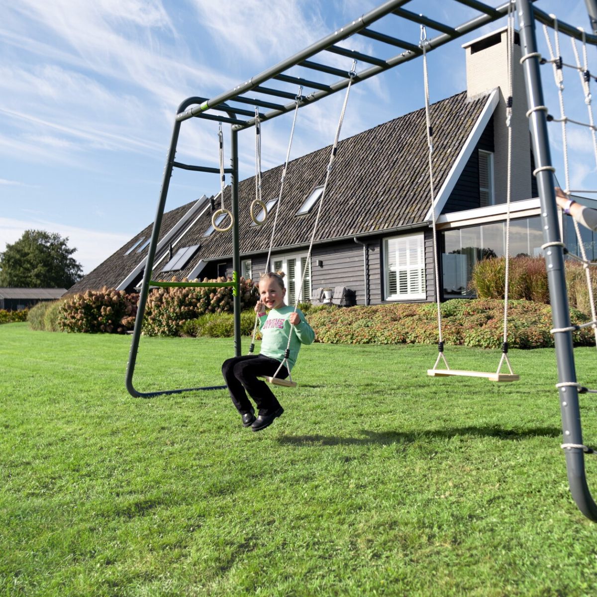 El GetSet MB300 crece con tu familia. El centro tiene espacio para tres accesorios y también puedes ampliar fácilmente los laterales. Añade un columpio de madera, anillas de gimnasia o una red de escalada para tus pequeños, para que aprendan a moverse con seguridad y se diviertan juntos. Para los más atléticos, accesorios como un saco de boxeo o una estación de fondos son el complemento perfecto.