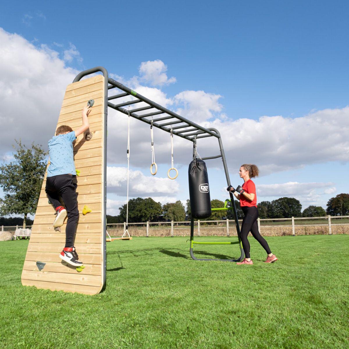 ¿Quieres transformar tu jardín en un espacio donde tus hijos puedan jugar al aire libre llenos de energía y donde tú te mantengas activo y en forma? La barra de mono EXIT GetSet MB300 es la solución perfecta para familias que desean combinar juego, ejercicio y fitness en un solo equipo multifuncional. Con casi cuatro metros de diversión para escalar y entrenar, puedes crear fácilmente un espacio donde toda la familia pueda disfrutar, relajarse y desafiarse a diario.