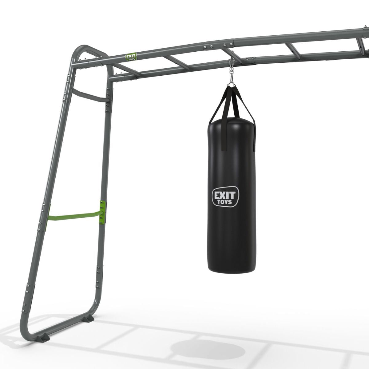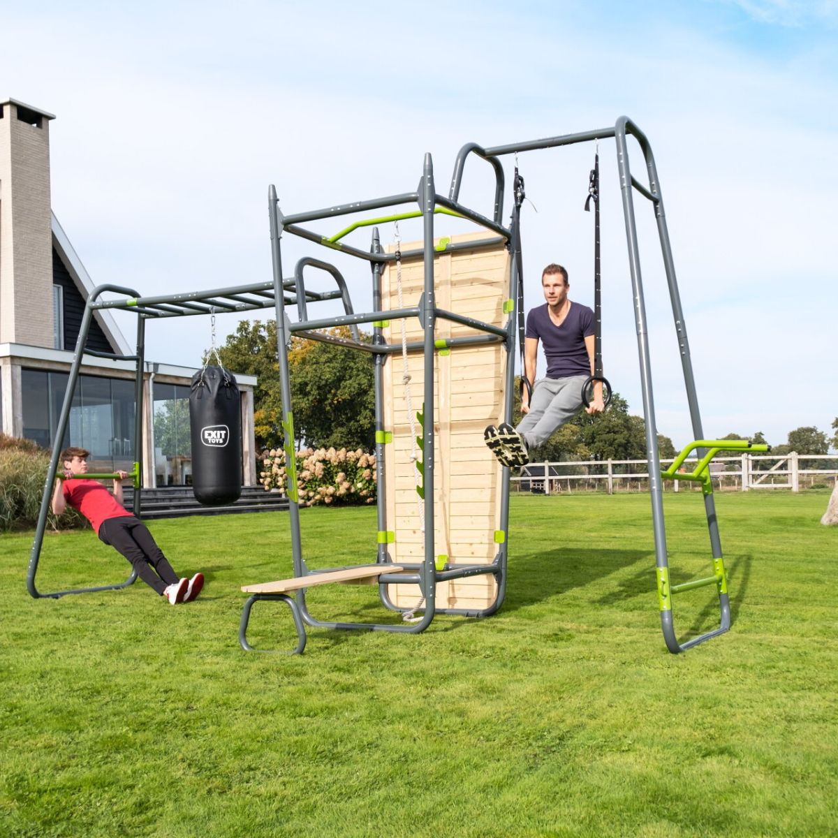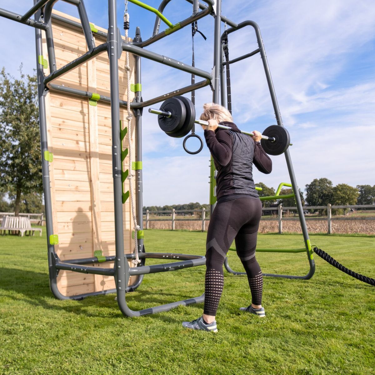El armazón está hecho de acero galvanizado con recubrimiento en polvo, resistente a la oxidación y a las inclemencias del tiempo. Los conectores de plástico evitan crujidos y chirridos, garantizando una sesión de entrenamiento cómoda. Con su moderno diseño oscuro y sus lujosos accesorios en tonos verdes, este equipo se integra perfectamente en cualquier jardín: elegante, con estilo y deportivo.