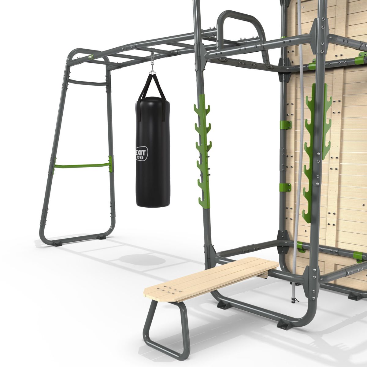 ¿Buscas una solución integral para entrenamiento de fuerza, cardio y coordinación, en tu propio jardín? El EXIT GetSet PS620 es un rack de fitness premium para exteriores de más de seis metros, diseñado para deportistas mayores de 14 años y adultos que buscan sacar el máximo provecho de sus entrenamientos. Con doce accesorios incluidos, como un saco de boxeo, un banco de fitness, una barra de mono y un rocódromo, puedes crear un gimnasio exterior completo para cualquier día, hora y nivel.