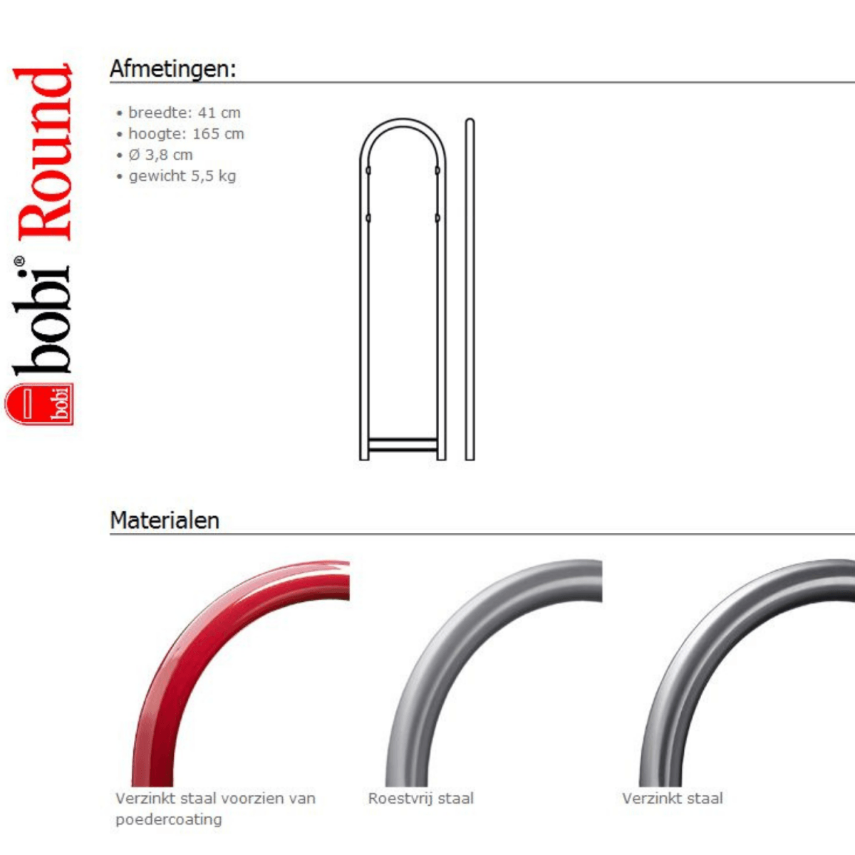 Bobi Round-Ständer bestehen aus 1 mm dickem Edelstahl (SS AISI 304) oder 1 mm dickem verzinktem Stahl, pulverbeschichtet in RAL-Farbe.