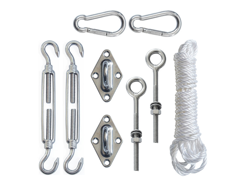 Sie möchten Ihr Sonnensegel fest, sicher und richtig aufhängen? Dieses komplette Montageset enthält alles, was Sie zur Installation Ihres Sonnensegels zwischen Wänden, Pfosten oder anderen Strukturen benötigen. Das Set ist für nahezu jede Art von Schattentuch geeignet und sorgt für einen langlebigen, stabilen und sauberen Abschluss Ihres Outdoor-Projekts.